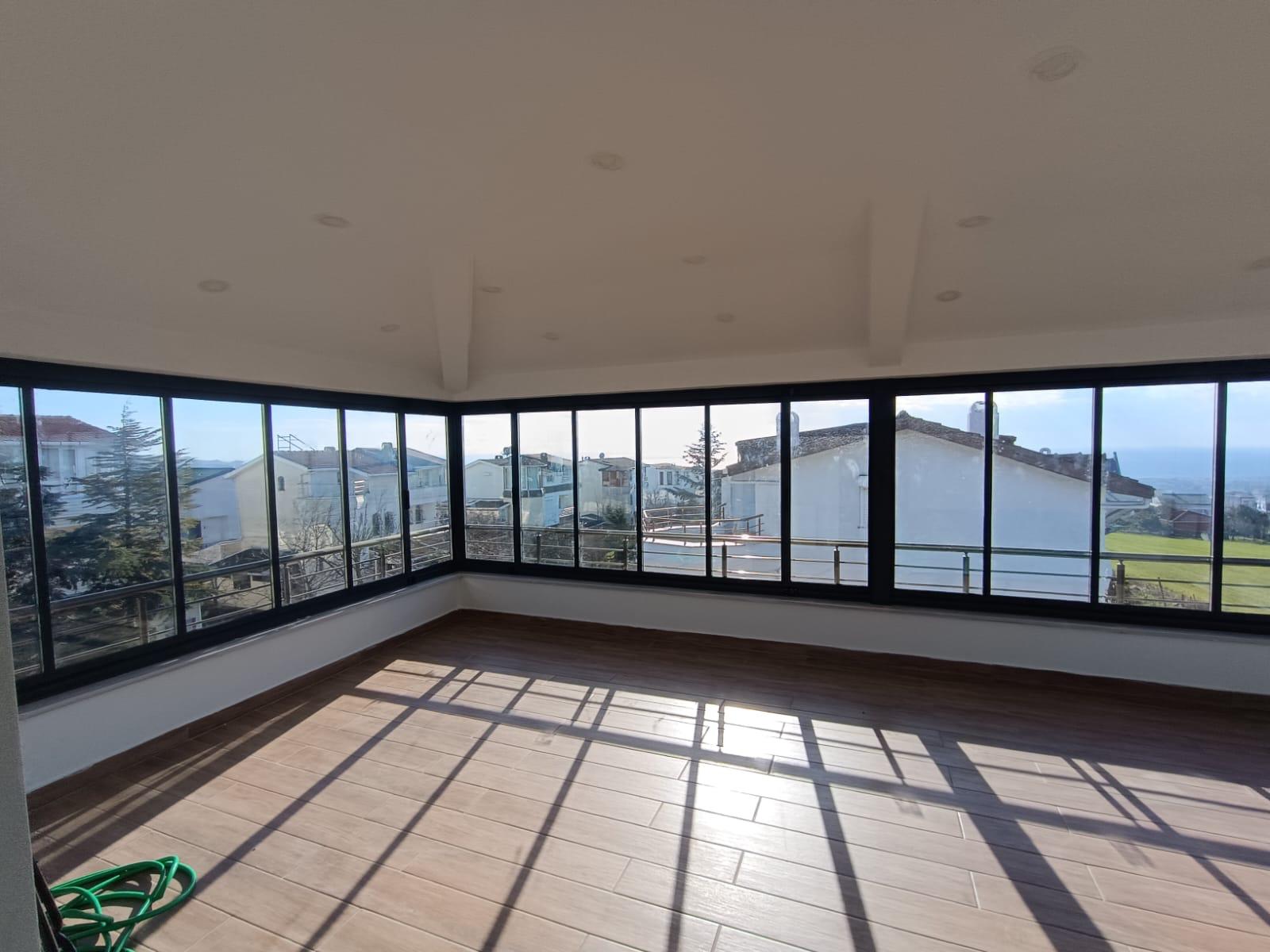 Giyotin Camlı Kış Bahçesi UygulamasıProjeye özel tasarlanan kış bahçesi, motorlu giyotin cam sistemiyle tamamlandı. Yukarı-aşağı hareket edebilen cam paneller sayesinde alan hem açık hem kapalı olarak kullanılabilir hale getirildi. Geniş cam yüzeyler sayesinde gün ışığı maksimum düzeyde içeri alınırken, rüzgar ve yağmur gibi dış etkenlerden korunma sağlandı.